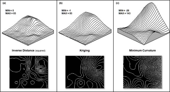 Distance, Kriging and Minimum Curvature interpolation results. (Interpolation
