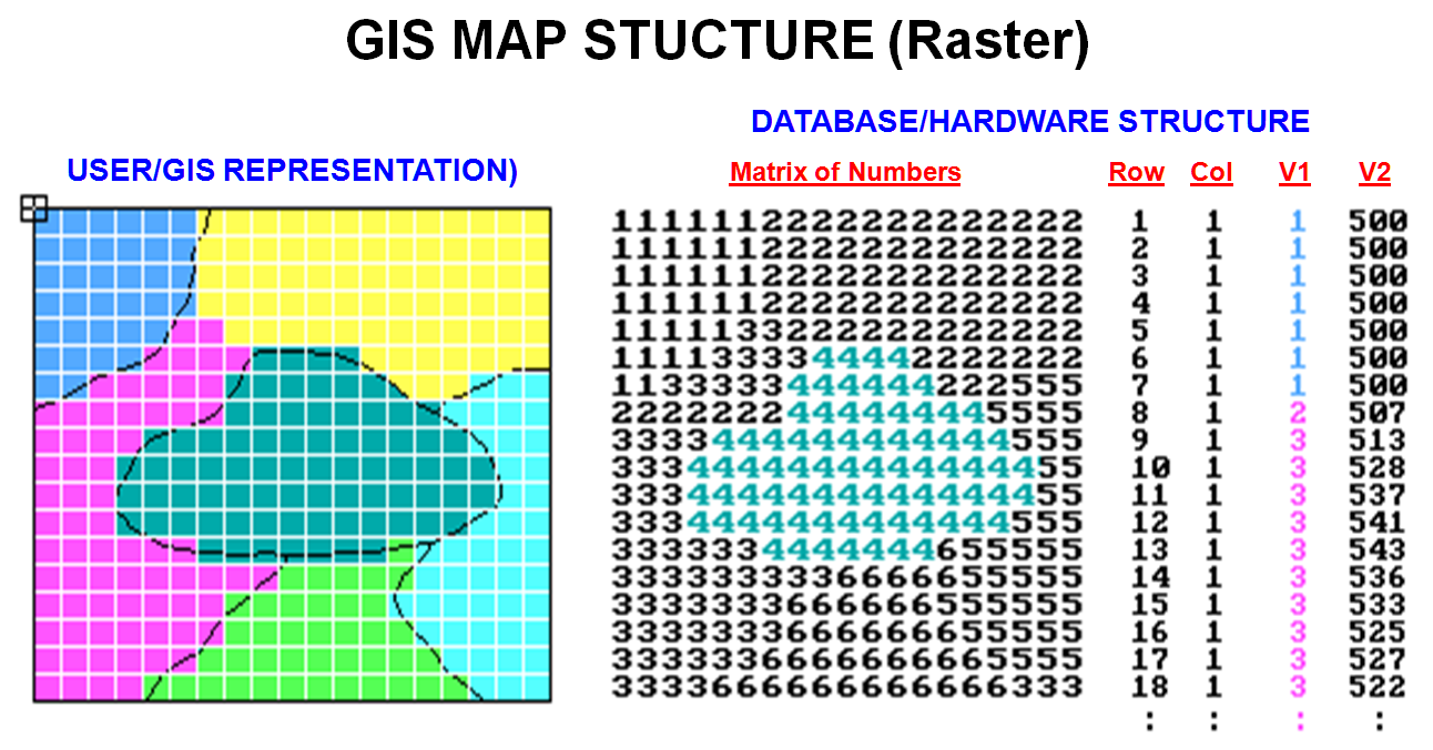 So what else do we have in raster structures?  Consider the right side of figure 1.  The structure uses a standard database file (a “database table") with the column/row entries of the matrix explicitly stored as "fields" (i.e., separate columns).  The subsequent fields contain the listing of values for various data layers.  Note that the set of soil values under V1 corresponds to the left-hand column of the matrix.   If there was room in the figure to list the rest of the values in the field, the next set would replicate the next column to the right in the matrix, then the next, and so on.  The V2 listing depicts similarly organized elevation values.