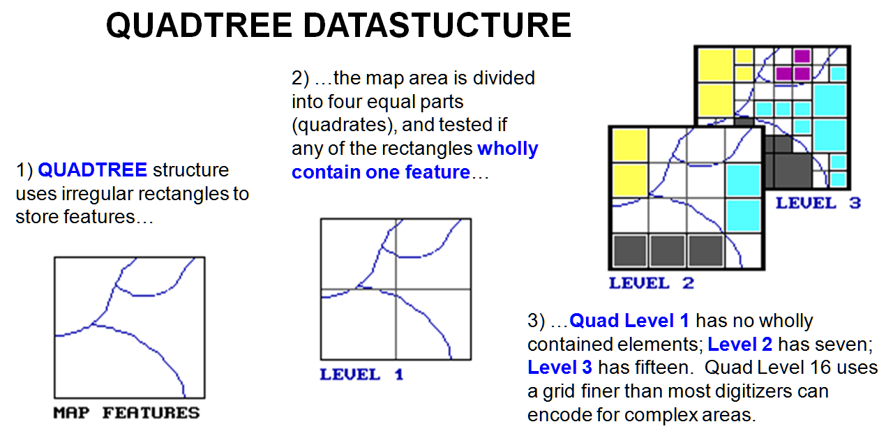 At that point the computer tests whether any quadrant wholly contains a single map characteristic.  In the example there are none, so each of the panels is divided into its quads (Level 2).  At that point, there are seven of the 16 quadrants that wholly contain a single characteristic.  Their positions in the four-by-four grid are noted, and the remaining nine mixed panels are divided into their quads (Level 3).  Fourteen of these are noted as completed, and the remaining 22 are divided for Level 4 of the quadtree.  The process is repeated until an appropriate quad level resolution is reached.  At level 16, a gridding resolution of 65,536 rows by 65,536 columns is available wherever it is needed— that equates to a fixed raster grid of 4,294,967,296 cells!  But the quadtree isn't forced to use that resolution everywhere so it accurately stores most maps in less than a megabyte.