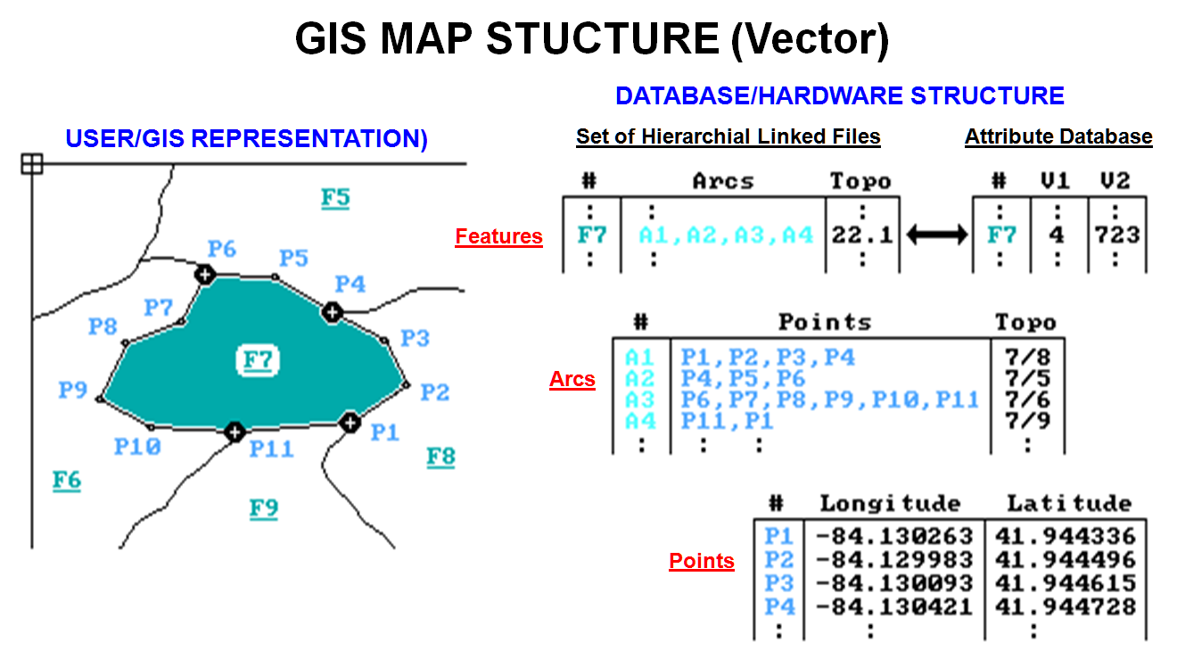 The features table puts it all together in geographic space by linking the “arcs” to actual map features.  In the example, feature F7 is formed by linking arcs A1, A2, A3, and A4.  The corresponding arcs table identifies which points are involved, with the coordinates in the points table ultimately tying everything to the ground.  At the top of this scheme is a linked info table with the attribute data for each map feature.  In the example, feature F7 is identified as having soil type 4 (field V1) and an average elevation o1723 (field V2).