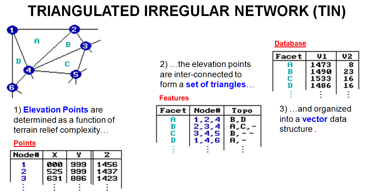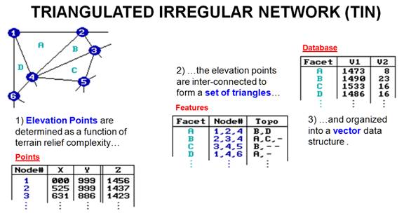 As shown in figure 2, the XY coordinate (location) and the z coordinate (elevation) are stored in a points table similar to traditional vector structure.  The triangular facets are defined in a features table by their three nodes and adjoining facets.  The final link is to an attribute table which contains descriptive information on each facet.  Awesome shaded relief maps can be generated by plotting the facets in 3-D and shading them as functions of their slopes and aspects.