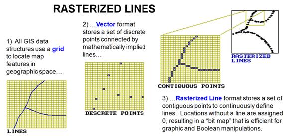 Rasterized lines retain all the dots along the lines.  At first that seems stupid, because the points file is huge.  Where an arc might require 10 discrete points, a rasterized line might require 100 or more.  Some tricks in data compression and coordinate referencing can help, but it requires a lot more storage any way you look at it.  So why would anybody use a rasterized line structure?  Primarily because it's a format hardware loves.  Faxes, scanners, screens, plotters and printers are based on dot patterns.  As a result, much attention is paid to handling dotted data efficiently.  Also, advances in optical disk storage and memory chips are redefining our concept of a "storage hog" so these files seem smaller each year.