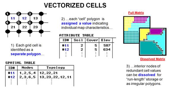 Another interesting offshoot, vectorized cells, cheats by storing each cell of an analysis grid as an individual polygon (figure 2).  It just so happens that all of the polygons have the same square configuration and adjoin their neighbors.  From a traditional vector perspective, each point defining a cell is a node; each cell side is an arc composed of just two nodes; and each cell is a polygonal feature composed of just four arcs.  That approach uses the existing vector structure without impacting the existing code.  It simply imposes consistency and uniformity in the polygons.  All that's needed is an import module to generate the appropriate configuration of vectorized cells and read the raster values into a field in the corresponding attribute table.  Raster-to-vector conversion can be completed by dissolving the pseudo-boundaries between adjoining polygons with the same value.  Line features can be converted by connecting the centers of cells with similar value.  Point features are represented by the coordinates of isolated cell centers.