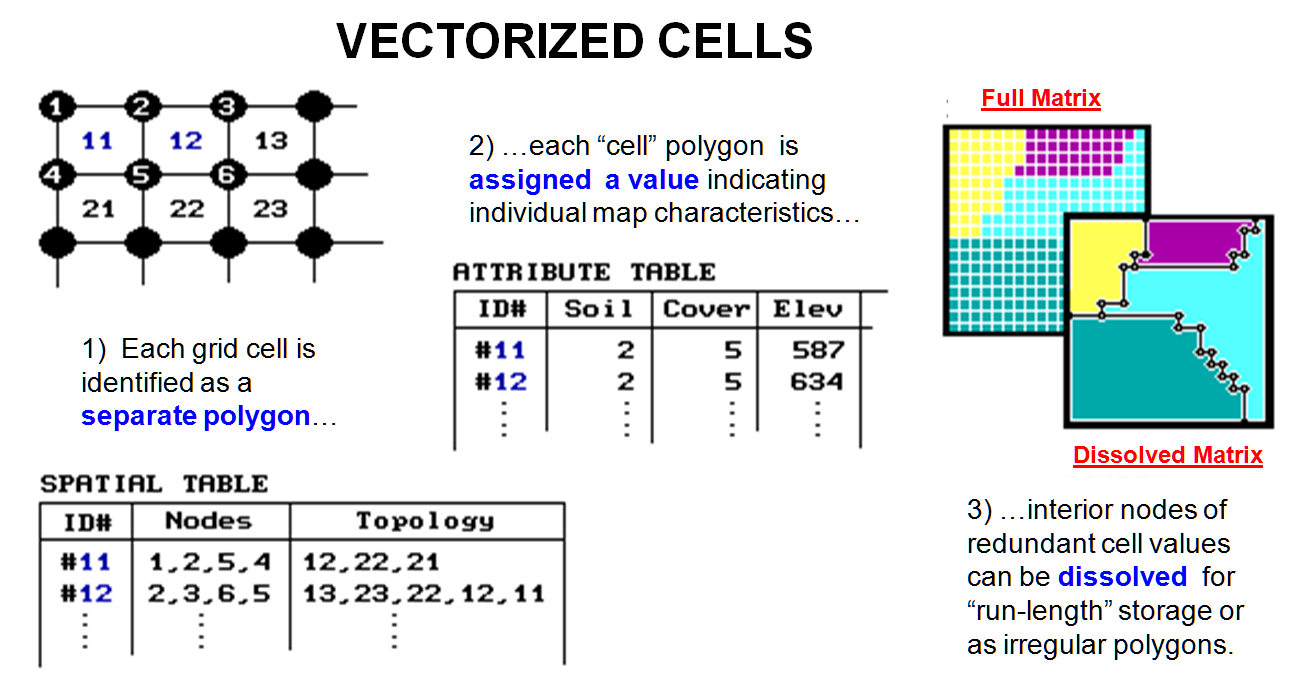 Raster is Faster, but Vector is Correcter   describes the structuring of traditional Vector data using explicit topology linking spatial and attribute tables