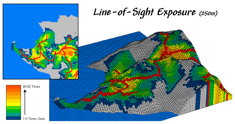 2 contains a map of the visual exposure within the 250-meter viewshed. Note the four areas of relatively high