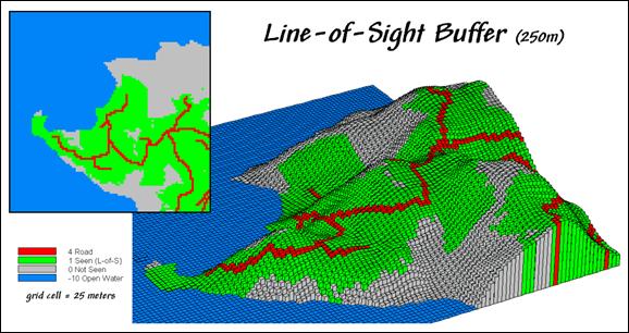 type of variable-width buffer involves line-of-sight connectivity. In this application a viewer location