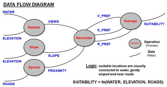 In the early years, the data and operations orientations dominated the developing field.  As GIS matured, the focus shifted to applications.  As a result, more attention is directed toward the assumptions and linkages that are embedded in GIS models—map analysis solutions to pressing problems.  In essence, we're weaving our data layers into complex, logical tapestries of map interrelationships.  A crucial component of this evolution is an effective mechanism to communicate model logic, as well as processing flow.