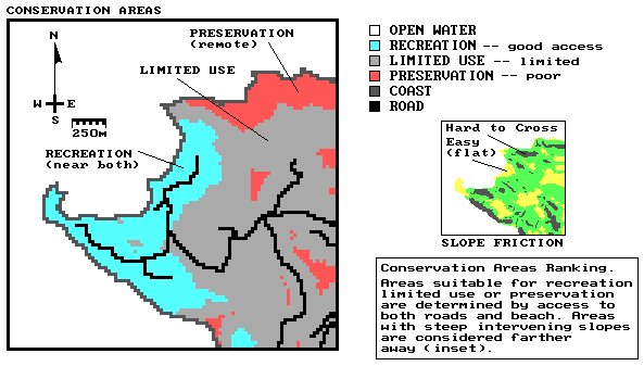 The two maps of weighted proximity from both the roads and the coast were combined into an overall map of accessibility.  The final step of the analysis involved interpreting relative access into conservation uses (see figure 1).  Recreation was identified for those areas near both roads and the coast.  Intermediate access areas were designated for limited use.  Areas effectively far from roads were designated as preservation areas.