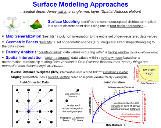 Map correlations provide a foothold for advanced inferential spatial statistics.  Spatial autocorrelation within a single map surface identifies the similarity among nearby values for each grid location.  It is most often associated with surface modeling techniques that employ the assumption that “nearby things are more alike than distant things”—high spatial autocorrelation—for distance-based weight averaging of discrete point samples to derive a continuous map surface.