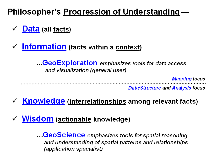 Most GeoExploration applications simply assemble spatial data into graphic form. While it might be a knock-your-socks-off graphic, the distillation of the data to information is left to visceral viewing and human interpretation and judgment (emphasizing Data and Information).