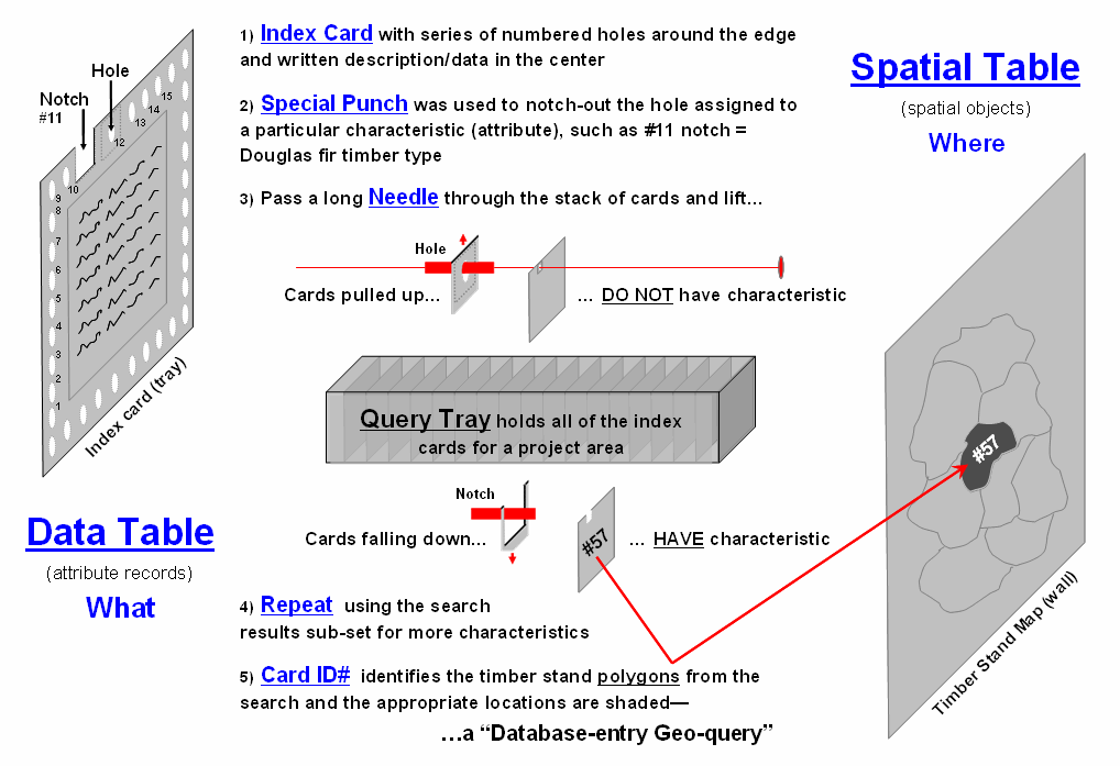 The heart of the system was a specially designed index card that had a series of numbered holes around its edge with a comment area in the middle. In a way it was like a 3x5 inch recipe card, just a little larger and more room for entering information. For my father, a consulting forester, that meant recording timber stand information, such as area, dominant tree type, height, density, soil type and the like, for the forest parcels he examined in the field (What). Aerial photos were used to delineate the forest parcels on a corresponding map tacked to a nearby wall (Where).