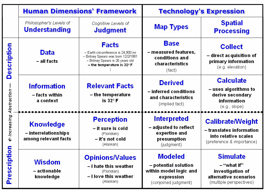 Current revolutionary steps in analytics and concepts are underway like the energized paddling beneath a seemingly serene swan. As a broad-brush framework for discussion of where we are heading, recall from your academic days the Philosopher’s Progression of Understanding shown in figure 2. It suggests that are differences between the spatial Data/Information describing geographic phenomena and the Knowledge/Wisdom needed for prescribing management action that solve complex spatial problems.