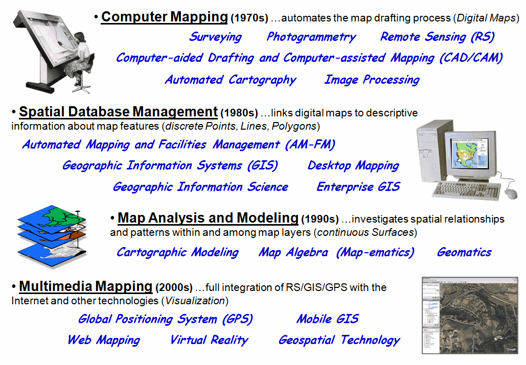The previous section traced the evolution of modern mapping by identifying some of the more important labels and terminology that have been used to describe and explain what is involved. In just four decades, the field has progressed from an era of Computer Mapping to Spatial Database Management, then to Map Analysis and Modeling and finally to Multimedia Mapping.