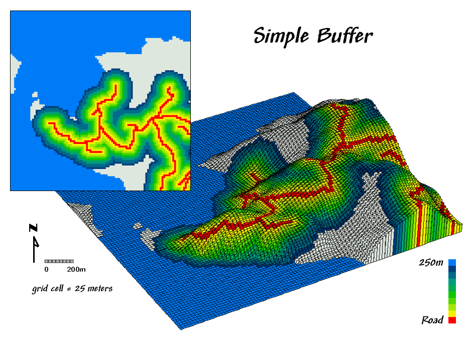 As noted in the previous section, simple buffers are often just that—too simple for real world applications. The assumption that there are uniform conditions throughout a fixed distance from a map feature rarely squares with reality. A consistent 100, 200 or 300-meter buffer around roads often includes inappropriate results within a buffer, such as ocean areas. Or they can include areas that are inconsistent with an assumption, such as a concern for just the uphill locations from roads.