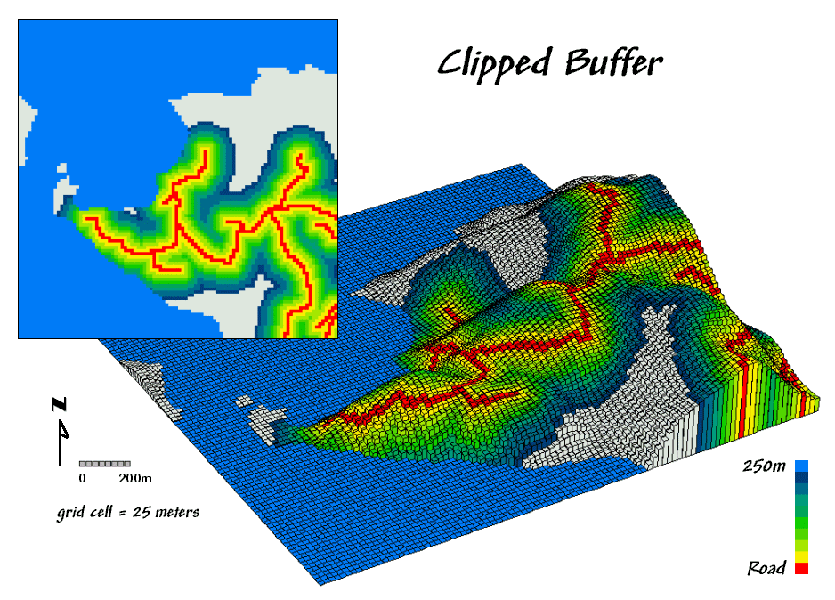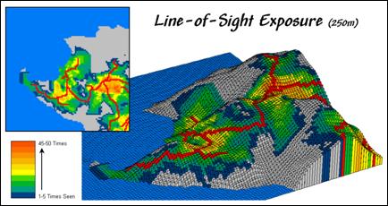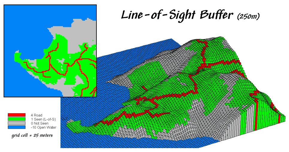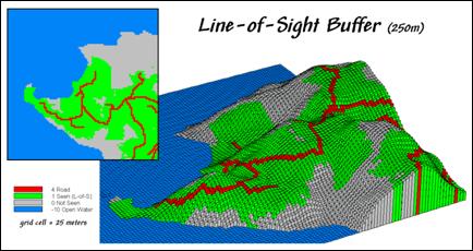 Figure 1 shows a 250-meter line-of-sight buffer surrounding the road network. Note that variations in the terrain cause the buffer to truncate areas that are not seen, yet are still within the 250-meter reach.