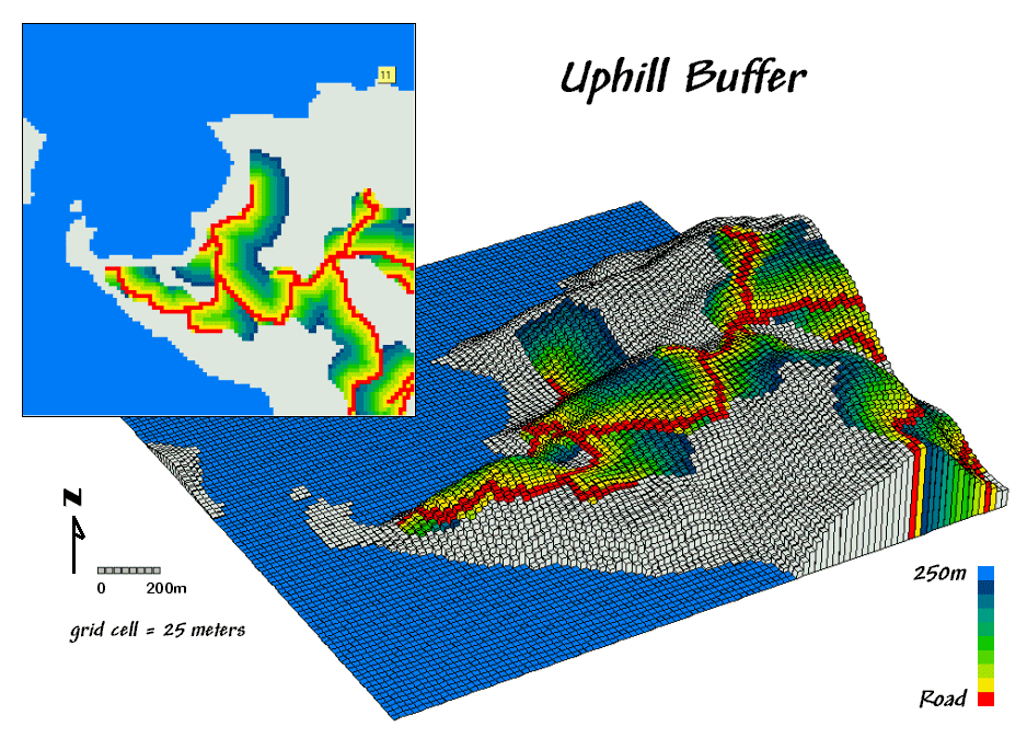 For example, consider the Uphill Buffer maps on the right side of figure 2. In this instance the measurement of proximity for the buffered area was forced to extend only “uphill” from the roads as defined on a guiding surface (a short conceptual step from a masking map). The results draped over the elevation surface confirms that only uphill locations are identified. By simply specifying “downhill” only those locations that are below the roads (and not within in the ocean mask) would be identified.