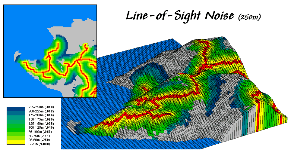 Or a developer might focus on candidate areas for “Soothing Acres Estates” that have minimal visual exposure and road noise. Spatial modeling of noise dissipation can be a complex undertaking, but line-of-sight connectivity is a fundamental element. While sound waves bend more than light waves, they also tend to be blocked by intervening terrain. A road on the other side of a ridge is neither seen nor heard—provided there is a big pile of dirt separating the source and receptor.