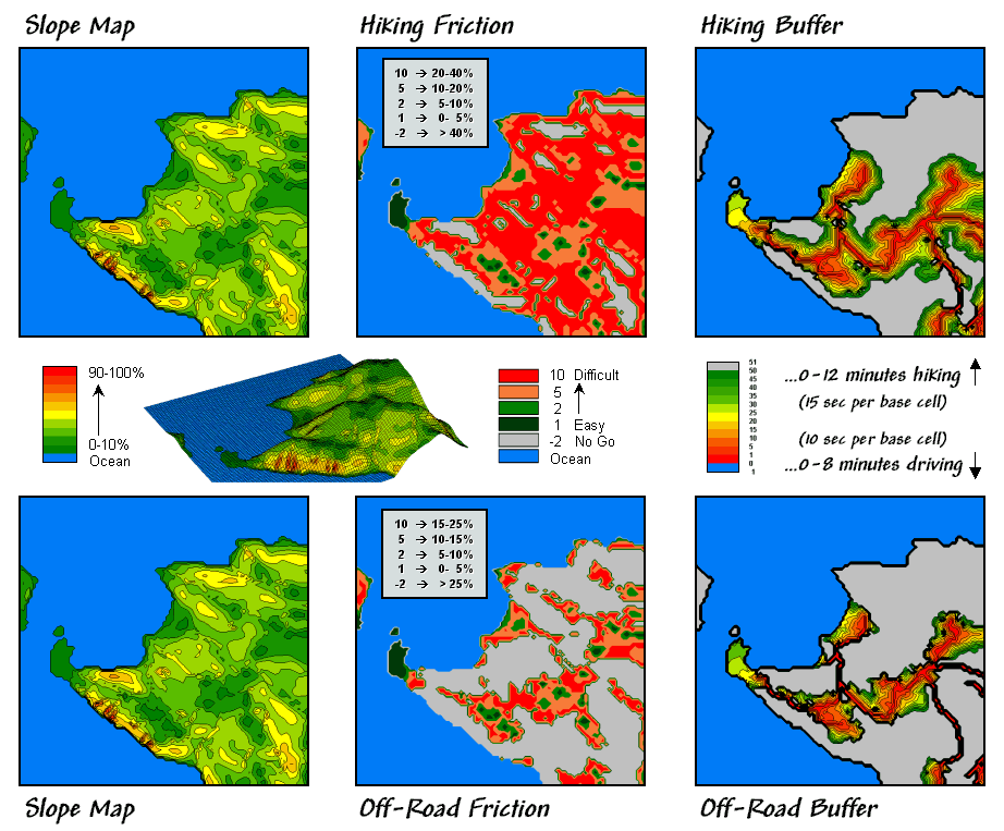 The effect of slope on defining a buffer’s reach is developed in Figure 2. The top left inset is a map of the slope conditions from 0 to 100 percent. The Hiking_Friction map calibrates the slopes in terms of the relative ease of foot-travel— 0-5% Easy, 5-10% Moderate, 10-20% Hard, 20-40% Difficult, and >40% a no-go situation.