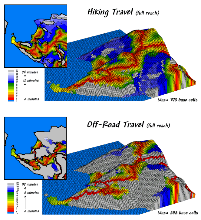 Also note the extended reach shown for the area in the lower right portion of project. The off-road travel map extends along a relatively gentle ridge but stops abruptly as the slopes exceed 25%. The hiking travel map, on the other hand, extends along the ridge and clear to the ocean. The gray tones indicate areas that are beyond reach (inaccessible) and can occur as pockets. The farthest location for a hiker is 94 minutes (378 effective cells) and for a off-road vehicle, is 39 minutes (232 effective cells).