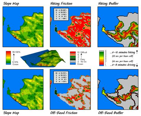 The lower set of maps in figure 2 repeats the analysis to create an effective-distance buffer assuming vehicular off-road travel. The slope map was calibrated for off-road travel assuming an 10 second base friction for the gentle slopes (0-5%); 20 seconds for 5-10%; 50 seconds for 10-15%; 100 seconds (1.7 minutes) for 15-25%; and >25% a no-go situation. Note the extensive area of inaccessible regions identified in the Off-Road_Friction map giving the buffer a spindly look.