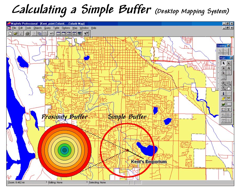 This information, however, can be misleading as it treats all of the customers within the buffer as the same. Common sense tells us that some street locations are closer to the store than others. A proximity buffer provides a great deal more information by dividing the buffered area into zones of increasing distance. But construction of a proximity buffer in a traditional mapping system involves a tedious cascade of commands creating buffers, geo-queries and table updates.