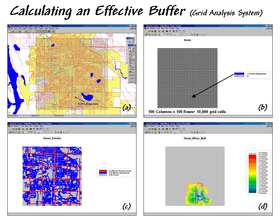 Figure 2 outlines a grid-based approach for calculating an effective buffer based on travel-time along the street network. The first step is to export the store and street locations from the desktop mapping system to a grid-based one. Inset (a) depicts the superimposition of a 100-column by 100-row analysis grid over an area of interest. In effect, the data exchange “burns” the store location into its corresponding grid cell (inset b). Similarly, cells containing primary and residential streets are identified (inset c) in a manner analogous to a branding iron burning the street pattern into another grid layer.