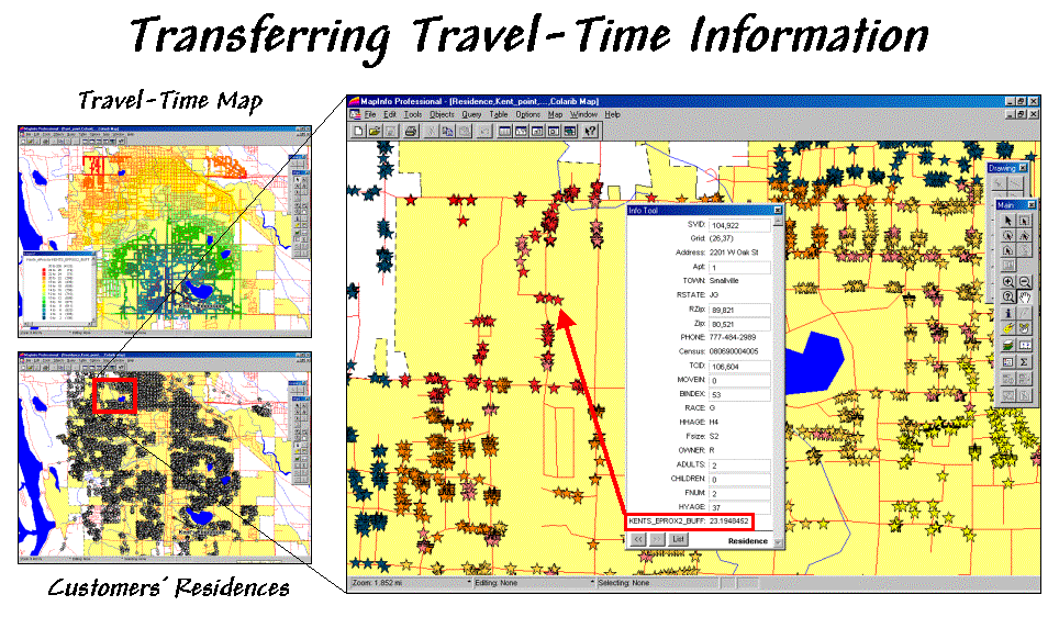 The result is shown in the large map on the right side of figure 1. The stars that identify customers’ residences are assigned “colors” depicting their distance from the store. The “info tool” shows the specific distance that was appended to a customer’s record. At this point, the derived travel-time information is fully available in the desktop mapping system for traditional thematic mapping and geo-query processing.
