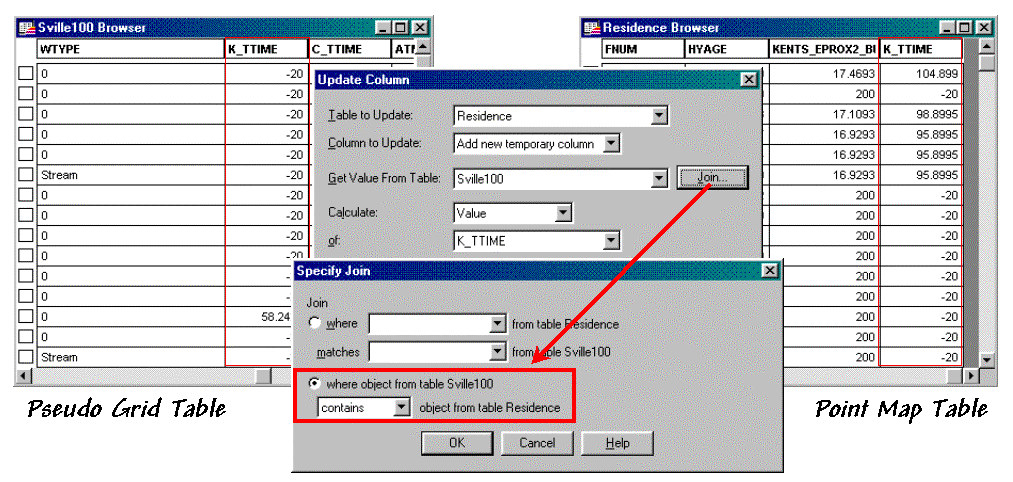 Most desktop mapping systems provide a feature for “spatially joining” two tables. For example, MapInfo’s “Update Column” tool can be used for the join as specified as “…where object from table <Sville100> contains object from table <Residences>”— Sville100 is the pseudo grid and Residences is the point map (see figure 2). The procedure determines which grid cell contains a customer point then appends the travel-time information for that cell (K_TTime) to the customer record. The process is repeated for all of the customer records and the transferred information becomes a permanent attribute in the Residences table.