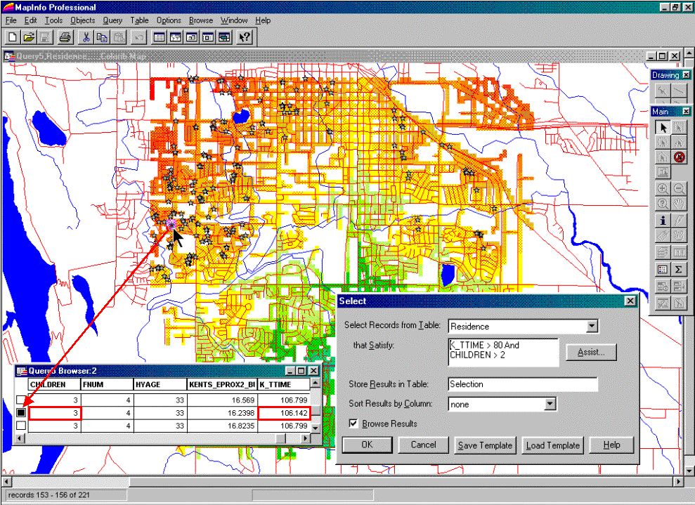 The result is a selection table that contains just the customers who satisfy the query. The map display in figure 3 plots these customers and shows a “hot link” between the selection table and one of the customers with three children who live 10.6 minutes from the store.