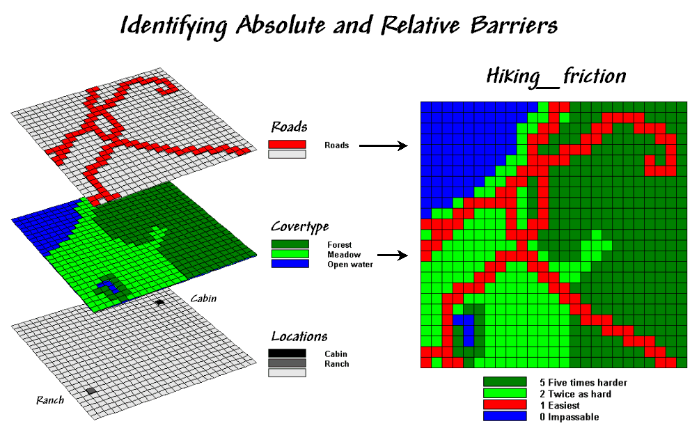 Neither does one apply on-road travel-time analysis when modeling off-road movement. Let’s assume you are a hiker and live at the ranch depicted in figure 1. The top two “floating” map layers on the left identify Roads and Cover_type in the area that affect off-road travel. The Locations map positions the ranch and a nearby cabin.