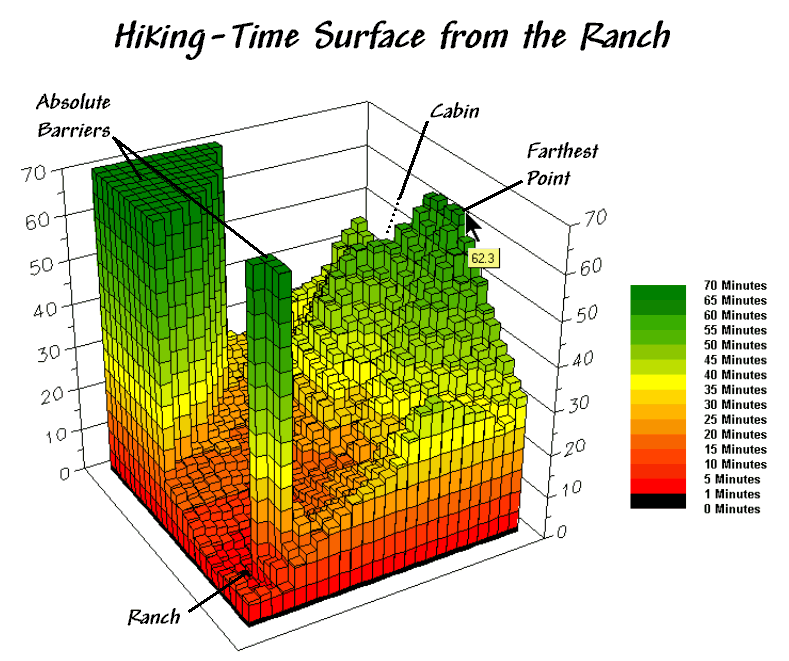 The result of the calculations identify a travel-time surface where the map values indicate the hiking time from the Ranch to all other map locations. For example, the estimated time to slog to the farthest point is about 62 minutes. However, the quickest hiking route is not likely a straight line to the ranch, as such a route would require a lot of trail-whacking through the dense forest.