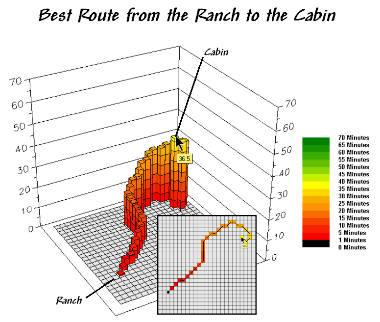 Actually, the optimal path retraces the effective distance wave that got to a location first—the quickest route in this case. The 3D display in figure 3 isolates the optimal path from the ranch to the cabin. The surface value (36.5) identifies that the cabin is about a 36-minute hike from the ranch.