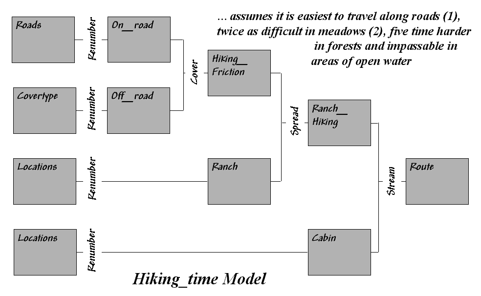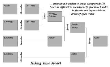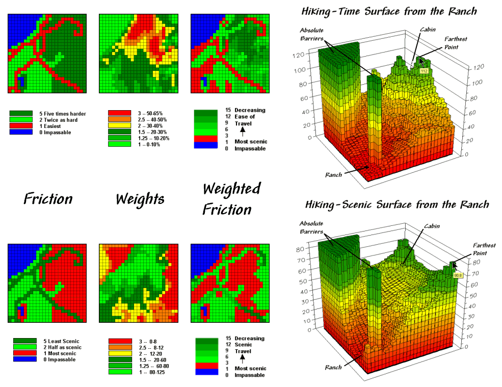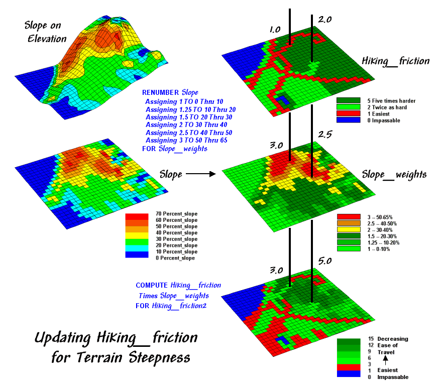 The slope map on the left side of the figure identifies areas of increasing inclination. The “Renumber” statement assigns a weight (figuratively and literally) to various steepness classes— a factor of 1.0 for gently sloped areas through a factor 3.0 for very steep areas. The “Compute” operation multiplies the map of Hiking_friction times the Slope_weights map. For example, a road location (1 minute) is multiplied by the factor for a steep area (3.0 weight) to increase that location’s friction to 3.0 minutes. Similarly, a meadow location (2 minutes) on a moderately step slope (2.5 weight) results in 5.0 minutes to cross.