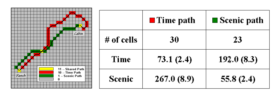 The table in the figure provides a comparison of the two paths. The number of cells approximates the length of the paths—a lot a longer for the “Time path” route (30 vs. 23 cells). The estimated time entries, however, show that the “Time path” route is much quicker (73 vs. 192 minutes). The scenic entries in the table favor the “Scenic path” (267 vs. 56). The values in parentheses report the averages per cell.