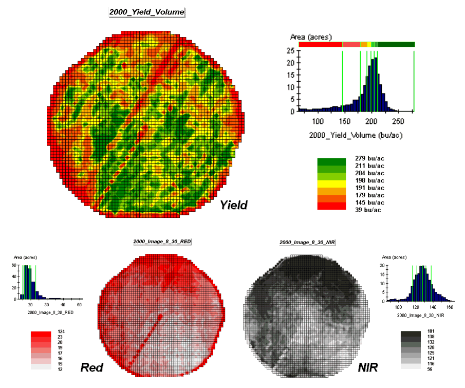 The independent map variables depicted in the bottom portion of the figure are used to uncover the spatial relationship— prediction equation. In this instance, digital aerial imagery will be used to explain the corn yield patterns. The map on the left indicates the relative reflectance of red light off the plant canopy while the map on the right shows the near-infrared response (a form of light just beyond what we can see).