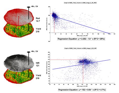 In a sense, the line sort of identifies the average yield for each step along the X-axis (red and near-infrared responses respectively). Come to think of it, wouldn’t that make a reasonable guess of the yield for each level of spectral response? That’s how a regression prediction is used… a value for red (or near-infrared) in another field is entered and the equation for the line is used to predict corn yield. Repeat for all of the locations in the field and you have a prediction map of yield from an aerial image… but alas, if it were only that simple and exacting.