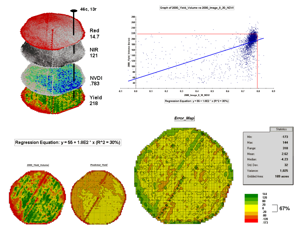 While it is difficult for you to assess the subtle relationships between corn yield and the red and near-infrared images, the computer “sees” the relationship quantitatively. Each grid location in the analysis frame has a value for each of the map layers— 3,287 values defining each geo-registered map covering the 189-acre field.