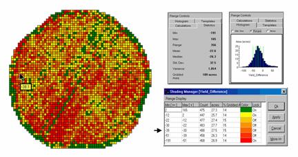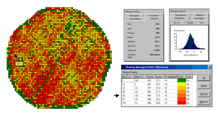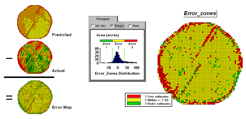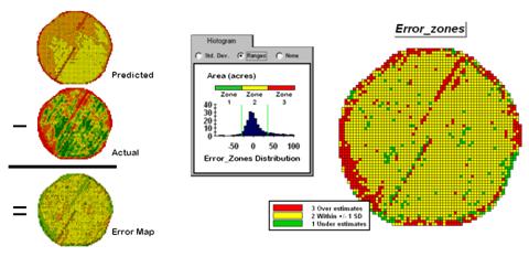 The left side of figure 1 shows the evaluation procedure. Subtracting the actual yield values from the predicted ones for each map location derives an Error Map. The previous discussions noted that the yield “guesses” weren’t too bad—average error of 2.62 bu/ac with 67% of the estimates within 20 bu/ac of the actual yield. However, some locations were as far off as 144 bu/ac (over-guess) and –173 bu/ac (under-guess).