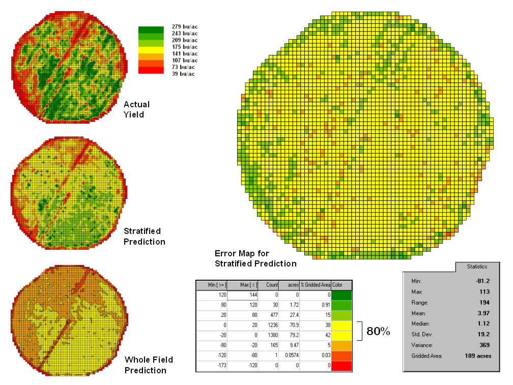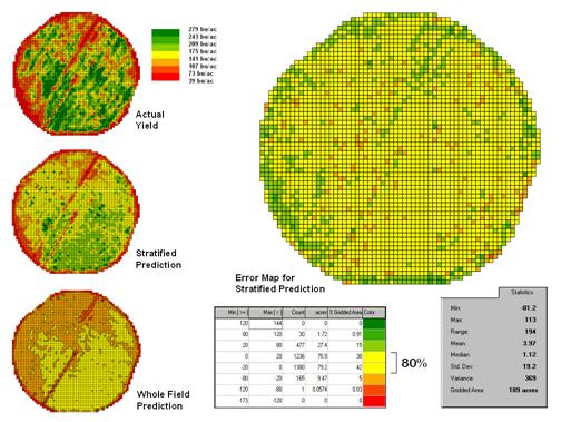 The left side of figure 3 provides a visual comparison between the actual yield and predicted maps. The “stratified prediction” shows detailed estimates that more closely align with the actual yield pattern than the “whole-field” derived prediction map. The error map for the stratified prediction shows that eighty percent of the estimates are within +/- 20 bushels per acre. The average error is only 4 bu/ac with maximum under and over-estimates of –81.2 and 113, respectively. All in all, not bad guessing of yield based on a remote sensing shot of the field nearly a month before the field was harvested.