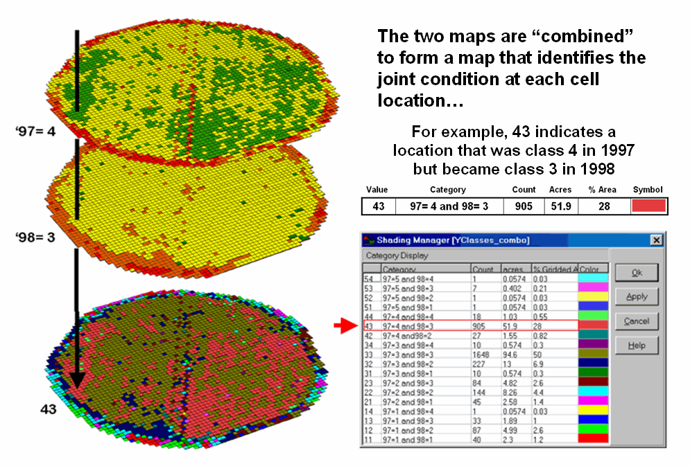 To illustrate the data mining procedure, the approach can be applied to the cornfield data that has been focus for the past several columns. The top portion of figure 1 shows the yield pattern for the field varying from a low of 39 bushels per acre (red) to a high of 279 (green). Corn yield, like “sales yield,” is termed the dependent map variable and identifies the phenomena we want to predict.