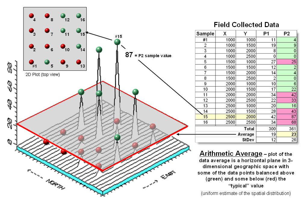 spatial distributions of field samples (floating balls) and their arithmetic