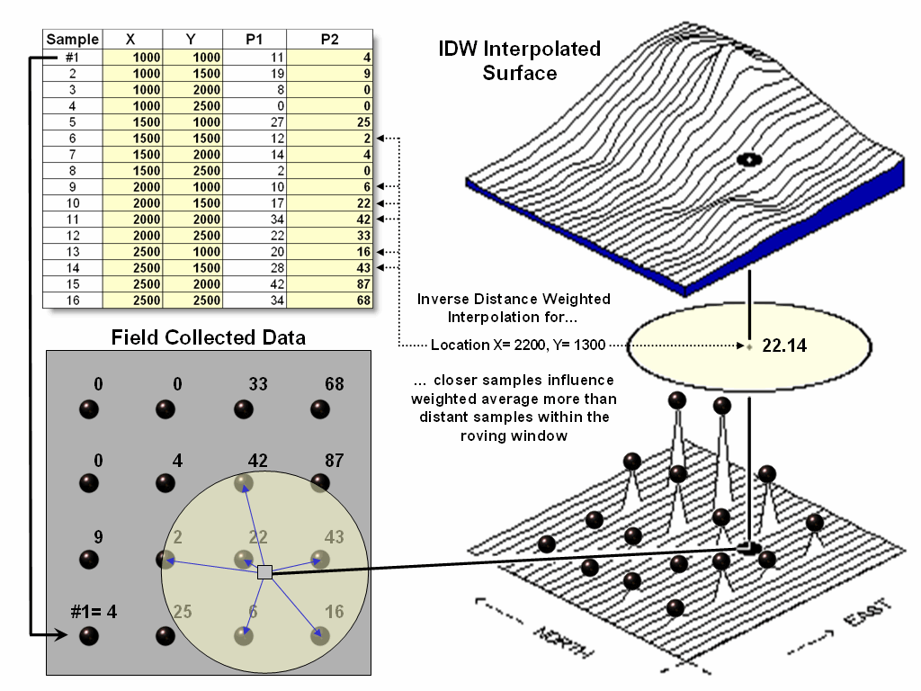 Figure 2. IDW calculations use simple geographic distance to weight the average