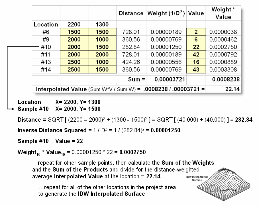 Figure 2 shows the IDW calculations for the location identified in figure 1. The Pythagorean Theorem is used to calculate the geographic distance between the location and the six sample values in the window. A weight for each sample is determined as 1/D2, then the weighted average of the samples is calculated and assigned to the location. The process is repeated for each location in the project area.