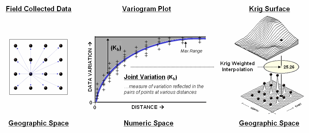 The center portion figure 3 illustrates how the Krig weights are derived. The distances between each sample point and all of the other sample points are calculated. At the same time, the differences in the sample values are recorded. Common sense suggests that “nearby things are more alike than distant things” and a plot of Distance versus Difference often looks something like the variogram in the center of the figure.