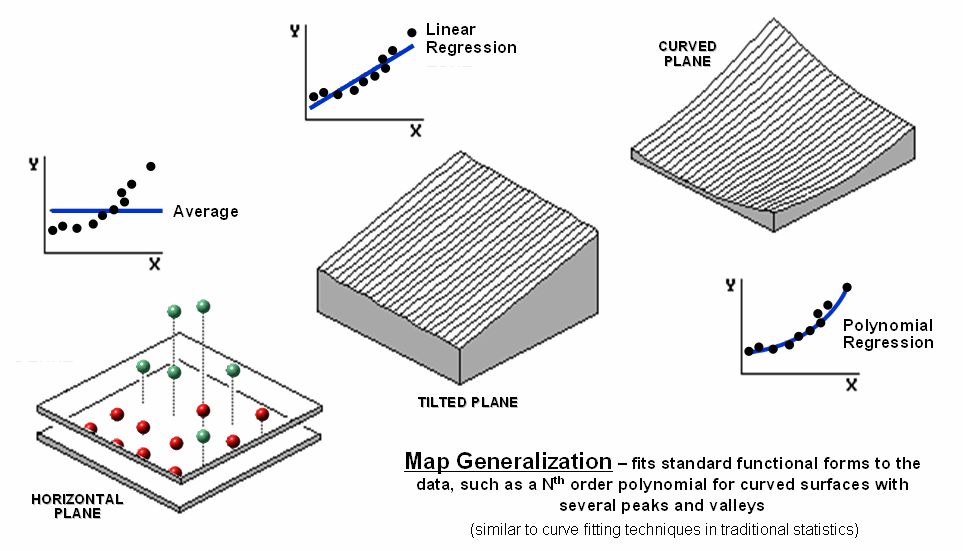 Figure 2 illustrates Map Generalization as an approach to mapping the spatial trend in the data using polynomial surface fitting. The average of 23 is depicted as a horizontal plane that does its best to balance half of the balls above it and half below it by minimizing the set of squared deviations from the plane to each floating ball (similar to curve-fitting regression techniques in traditional statistics).