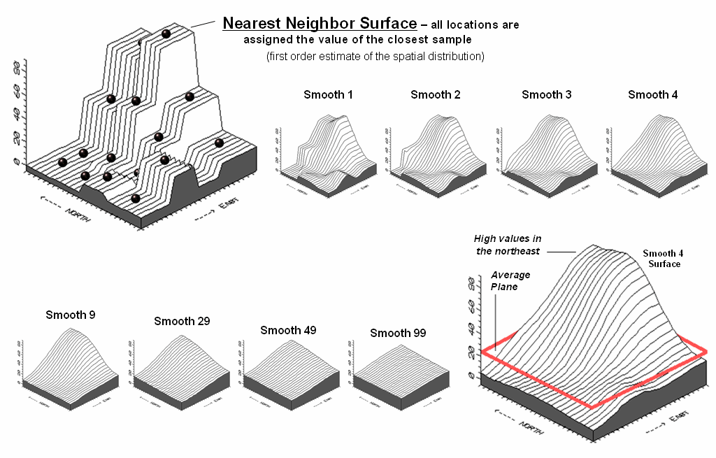 The Iterative Smoothing approach described last time is a simple data-driven procedure. However, all of the interpolation techniques share a similar approach that generates estimates of a mapped variable based on the data values within the vicinity of each map location. In effect, this establishes a "roving window" that moves throughout an area summarizing the field samples it encounters within its reach. The summary estimate is assigned to the center of the window, and then it moves on. The extents of the window (both size and shape) influence the result, regardless of the summary technique. In general, a large window capturing numerous values tends to smooth the data. A smaller window tends to result in a rougher surface.