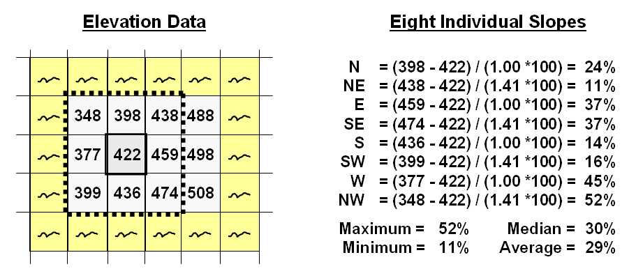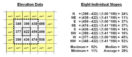 is 52% formed by the center and the NW neighboring cell. The minimum slope is 11% in the NE
