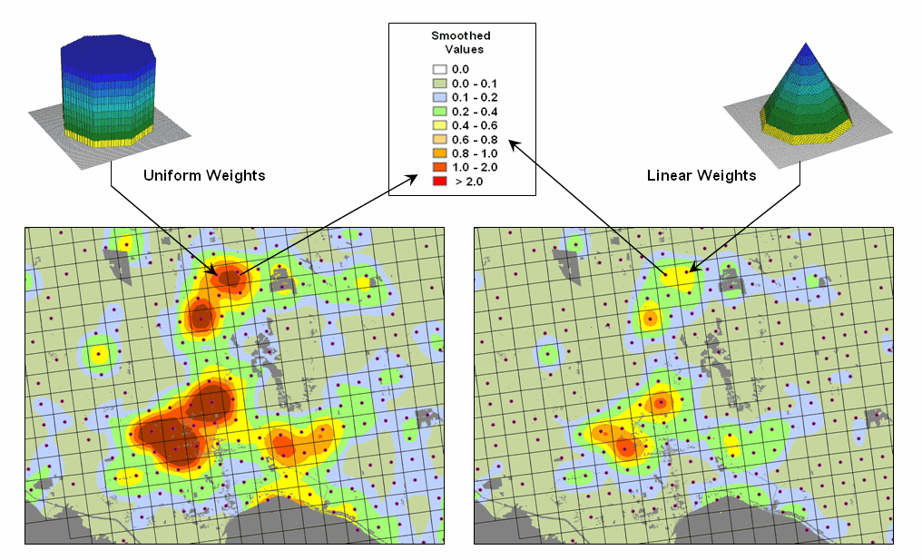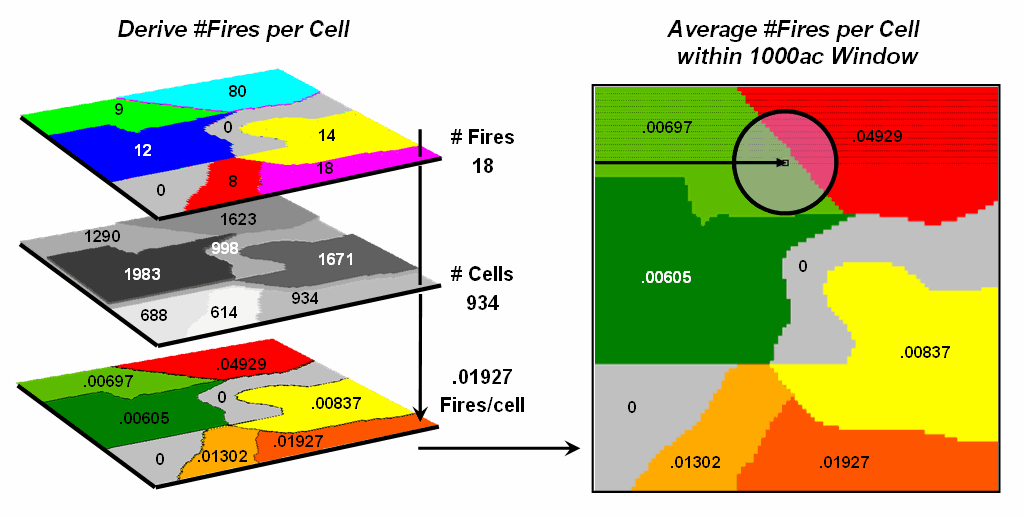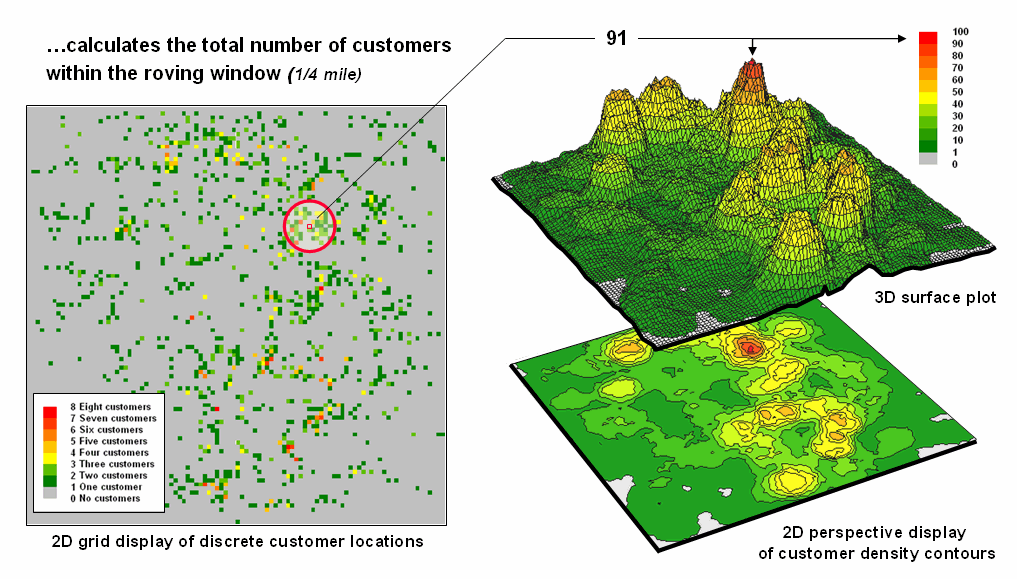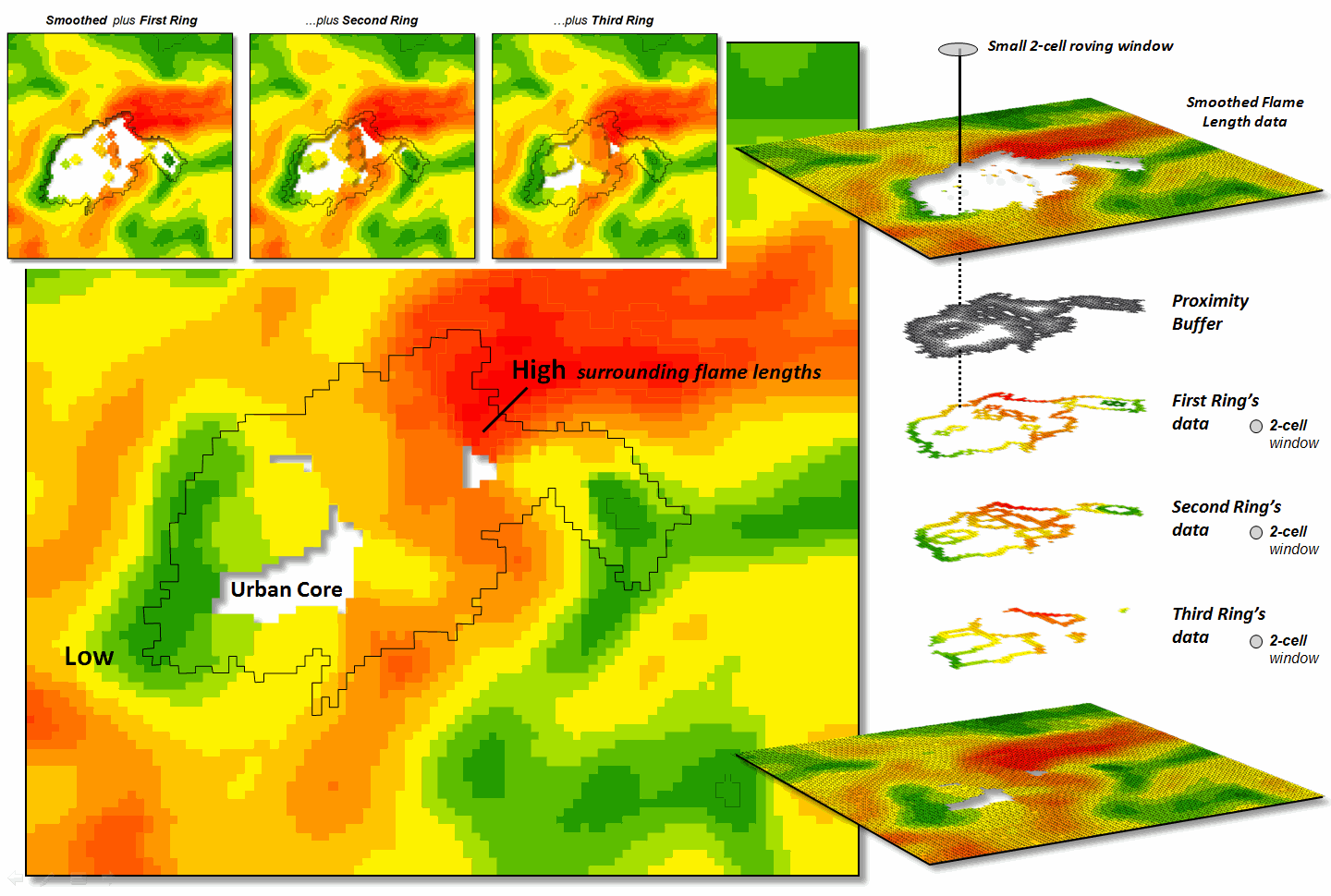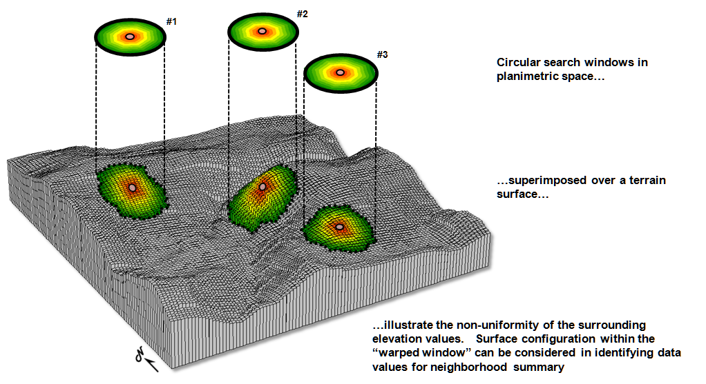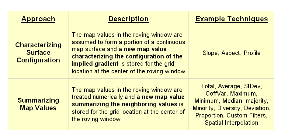 neighborhood values are obtained by a “roving window” moving about a map. To conceptualize the process, imagine a