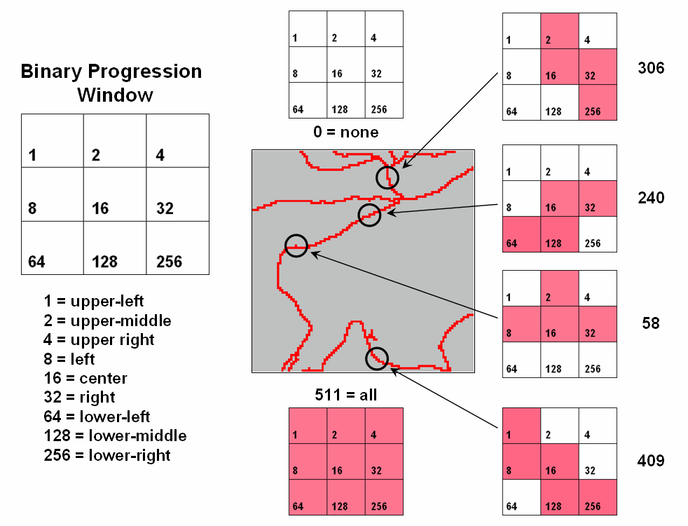 containing a value representing its overall elevation. In the highlighted 3x3 window there are eight