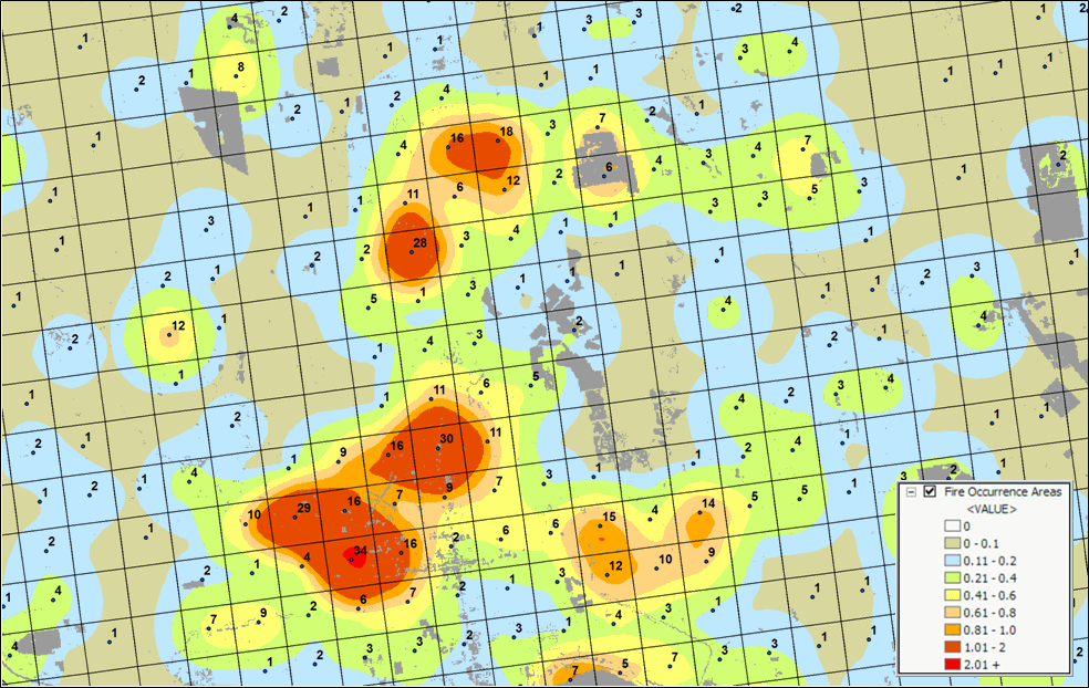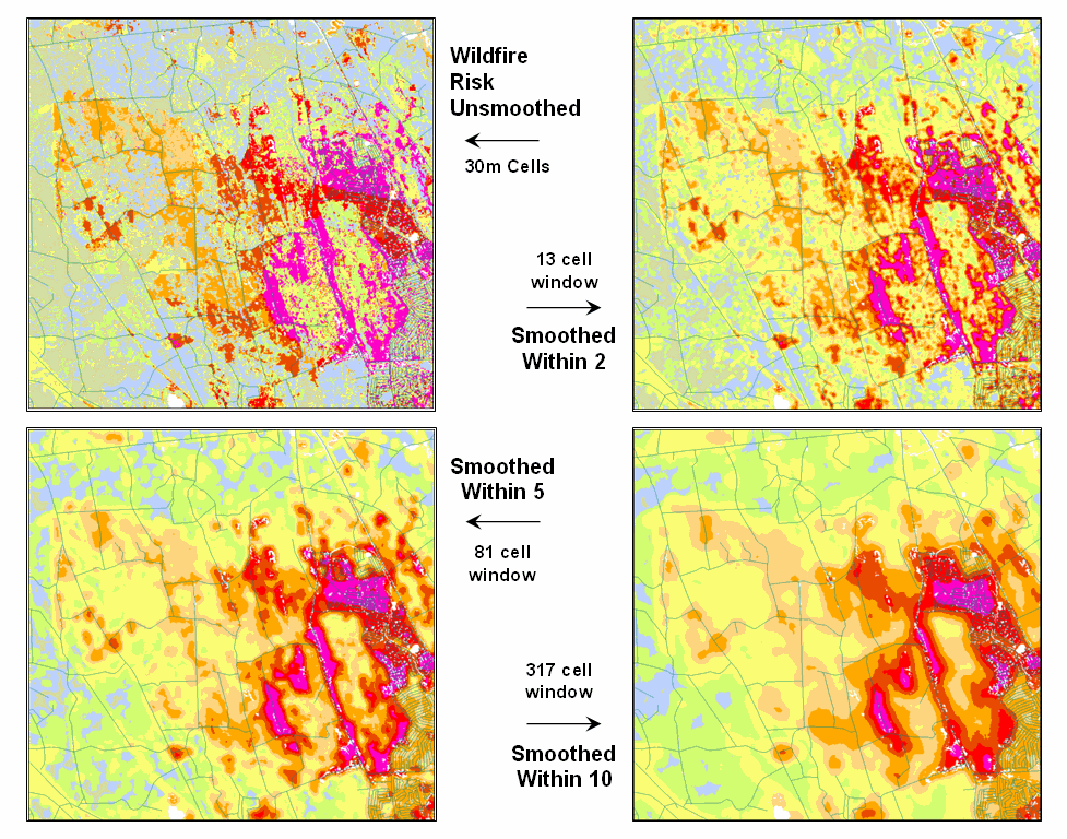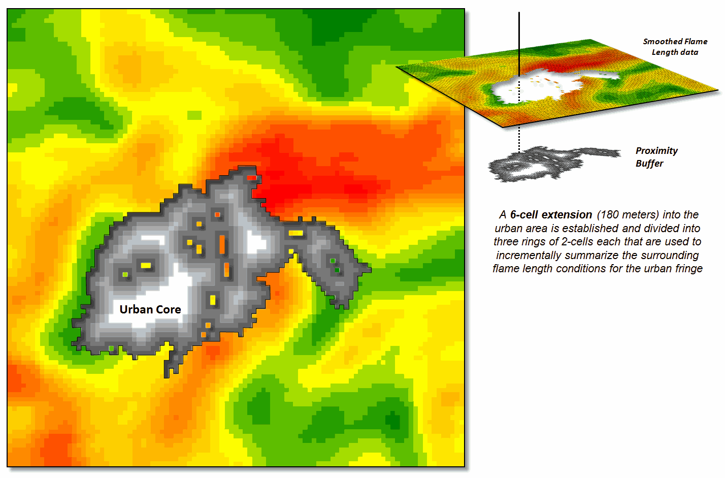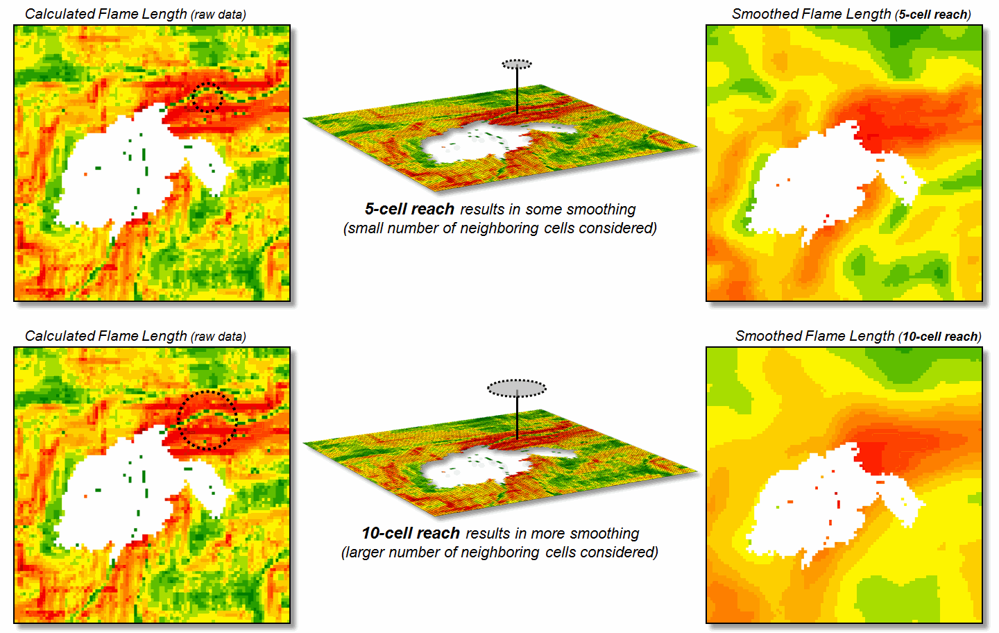 of slope with steep areas reaching farther away than gently sloped areas. In a wildfire risk model, the resultant “roving